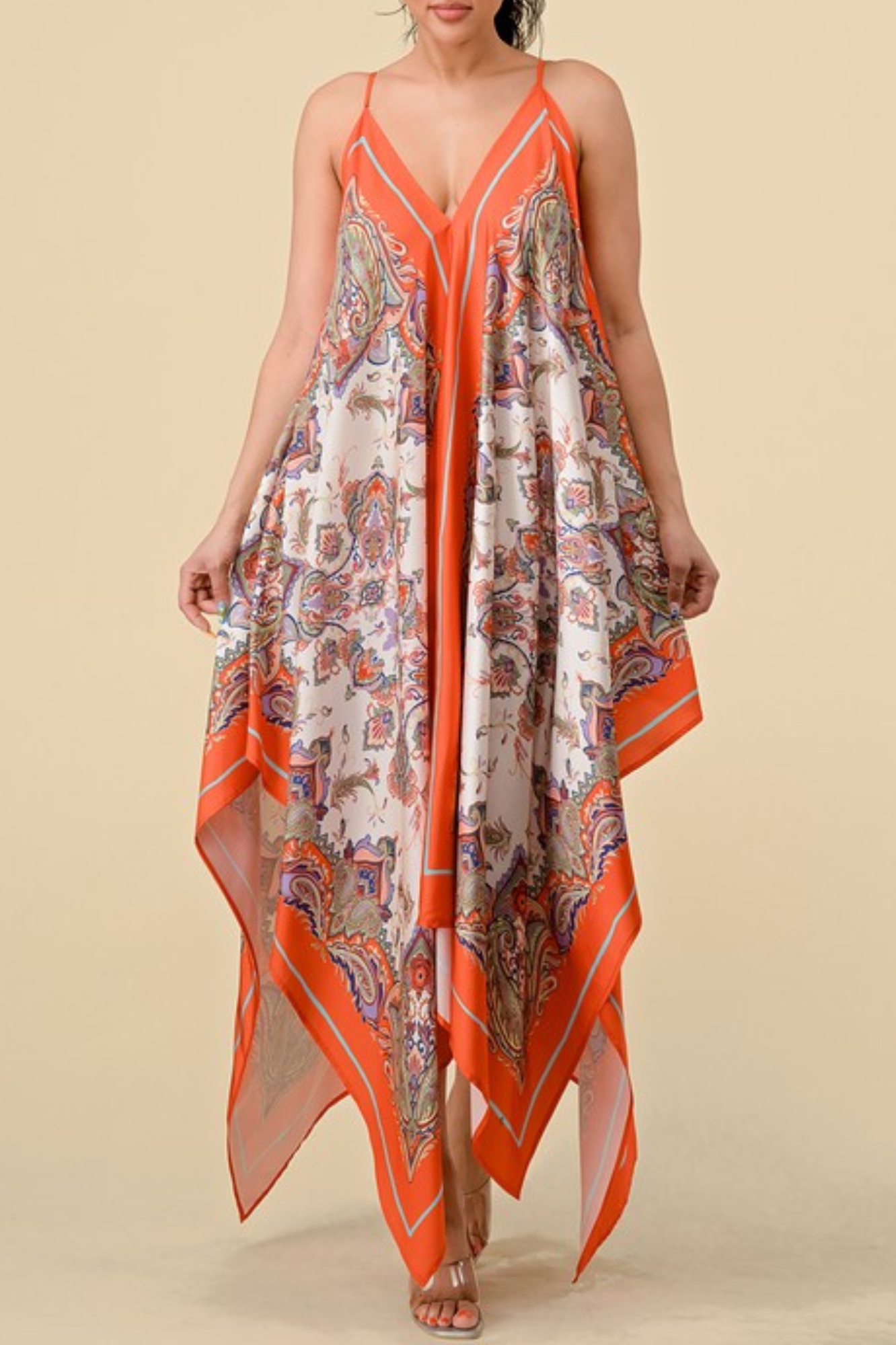 ORANGE COMBO SCARF BORDER PRINT SLEEVELESS DRESS